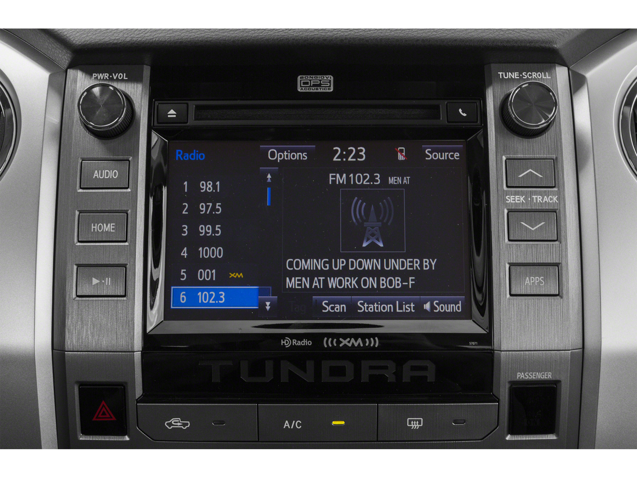 - Radio: Entune (subscription required) Audio Display AM/FM/HD w/CD Player -inc: MP3/WMA playback capability, high-resolution 7" touch-screen display, auxiliary audio jack, USB 2.0 port, iPod connectivity and control, iTunes Tagging, traffic and weather, Bluetooth® hands-free phone capability, phone book access, voice recognition and music streaming, SIRIUSXM Satellite Radio (subscription required)